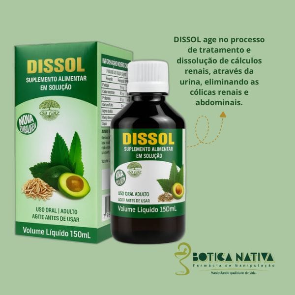 Dissol é destinado ao tratamento e dissolução dos cálculos renais e sua eliminação através da urina. Possui ação diurética, usado nas doenças renais e vias urinárias (uretrites, cistites, nefrites infecciosas), com a vantagem de provocar diurese abundante, porém retendo a albumina. Empregado nas afecções hepáticas, obstruções do fígado e hemorragia. Age no processo de dissolução dos cálculos renais e sua eliminação através da urina, combatendo as cólicas renais e abdominais. Precauções e advertências Deve-se evitar o uso de bebidas alcoólicas durante o tratamento, pois estas alteram o efeito do produto. O uso de outros medicamentos, juntamente com Dissol deve ser feito sob orientação médica. Pessoas acima de 65 anos devem consultar seu médico para o ajuste posológico. “Atenção diabéticos: este medicamento contém SACAROSE.” “Este medicamento contém ÁLCOOL.”.